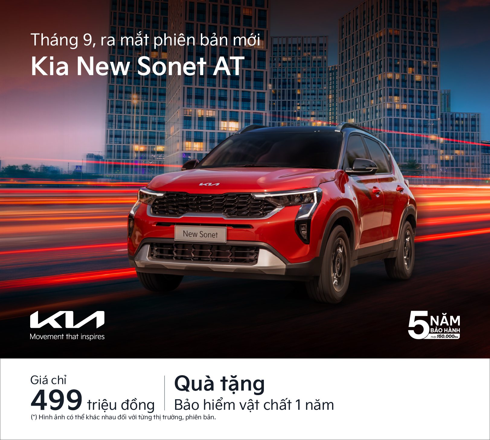 Tiếp nối thành công của mẫu xe Kia Sonet, Kia Việt Nam bổ sung phiên bản 1.5 AT cho mẫu xe này, tặng kèm 1 năm bảo hiểm vật chất, mang đến thêm lựa chọn đa dạng cho khách hàng mua xe lần đầu có nhu cầu sử dụng cá nhân di chuyển hằng ngày hay kinh doanh dịch vụ vận chuyển trong các đô thị với giá bán dễ tiếp cận, giúp khách hàng tối ưu chi phí sở hữu xe.